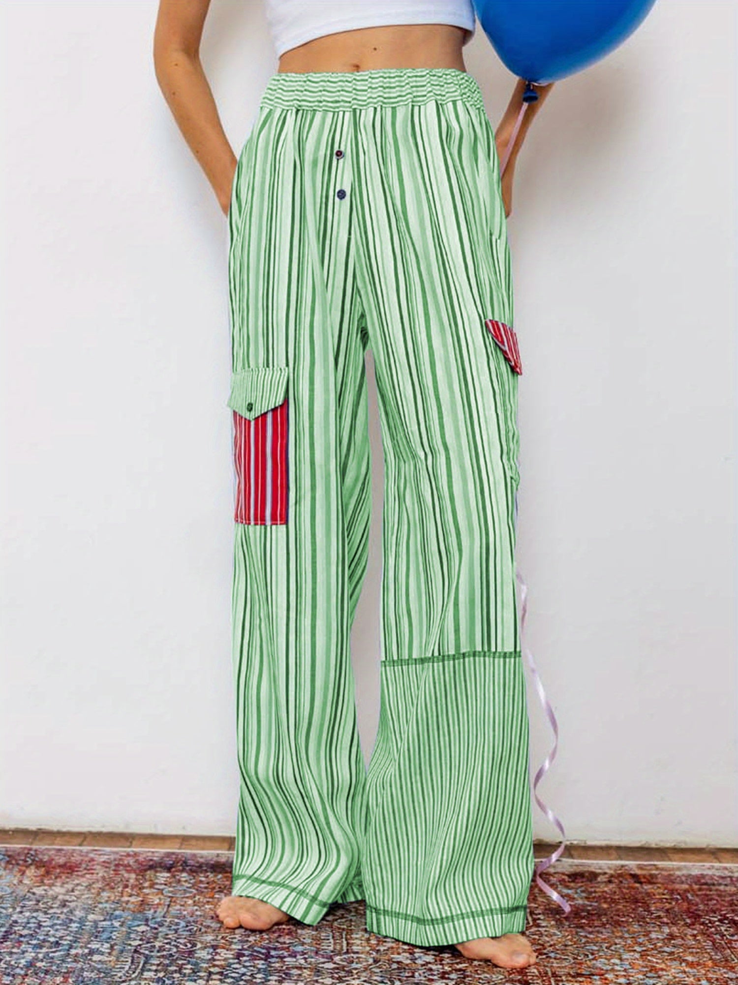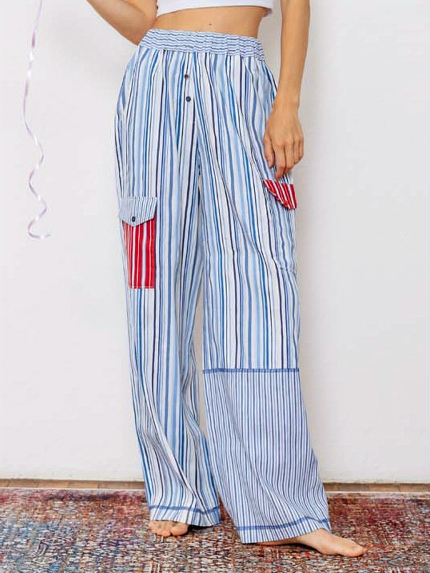 1pc Women'S Casual Striped Wide Leg Pants, Elastic Waist Loose Trousers with Pockets, Spring\u002FAutumn Streetwear for Adults