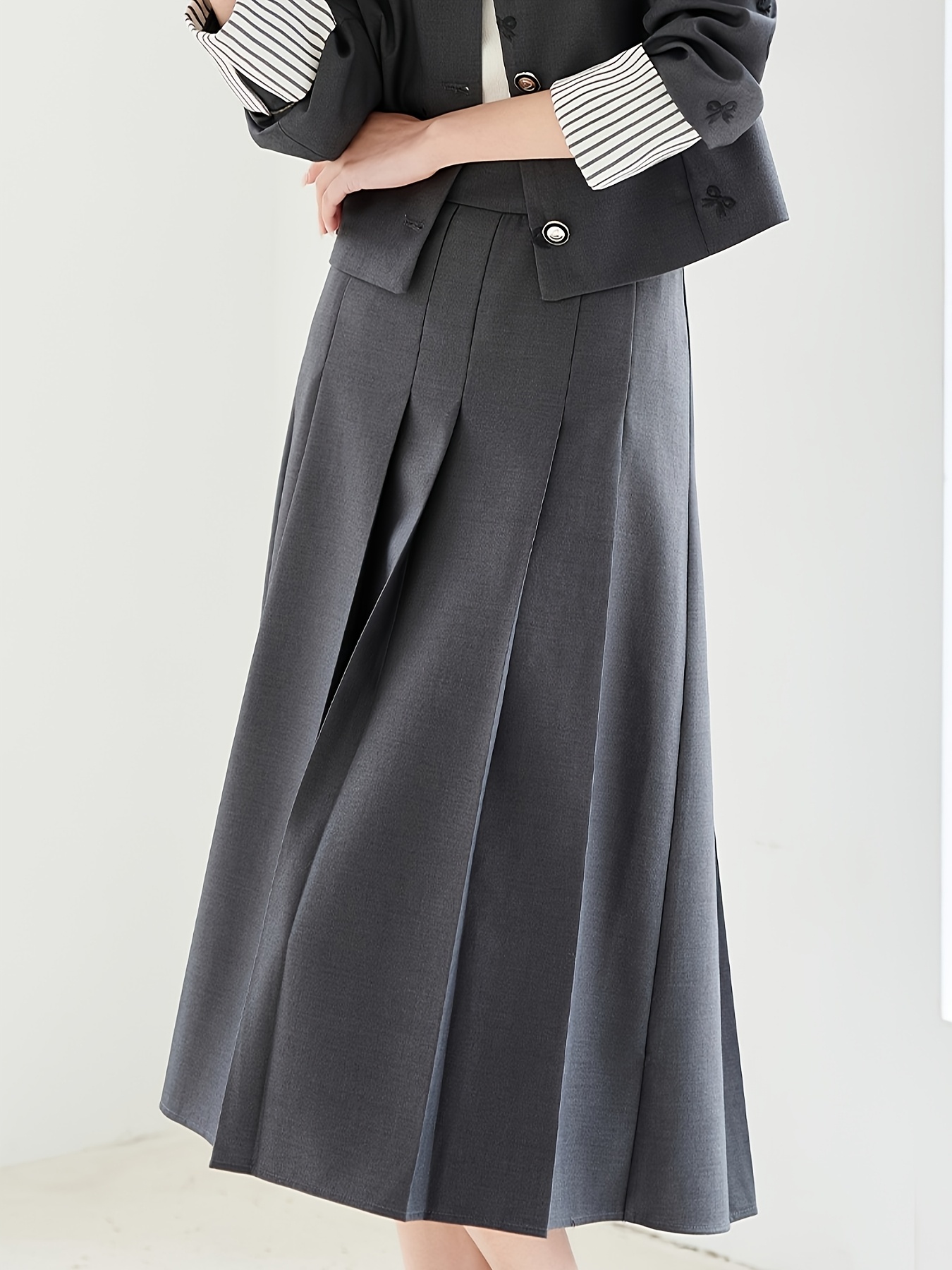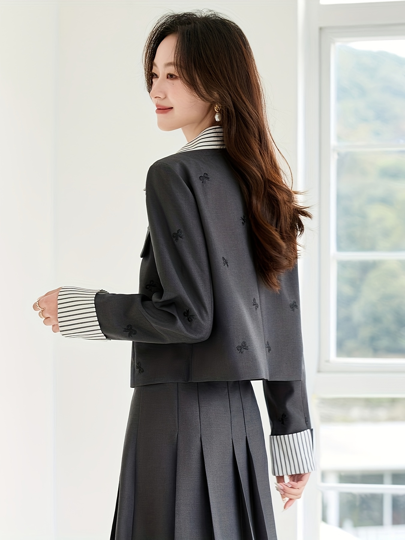 Elegant French-Inspired Butterfly Print Women'S Suit - Chic Black & White Striped Short Jacket with Embroidered Detail, Matching Midi Skirt Set for Spring\u002FFall, Button-Up, Non-Stretch Fabric