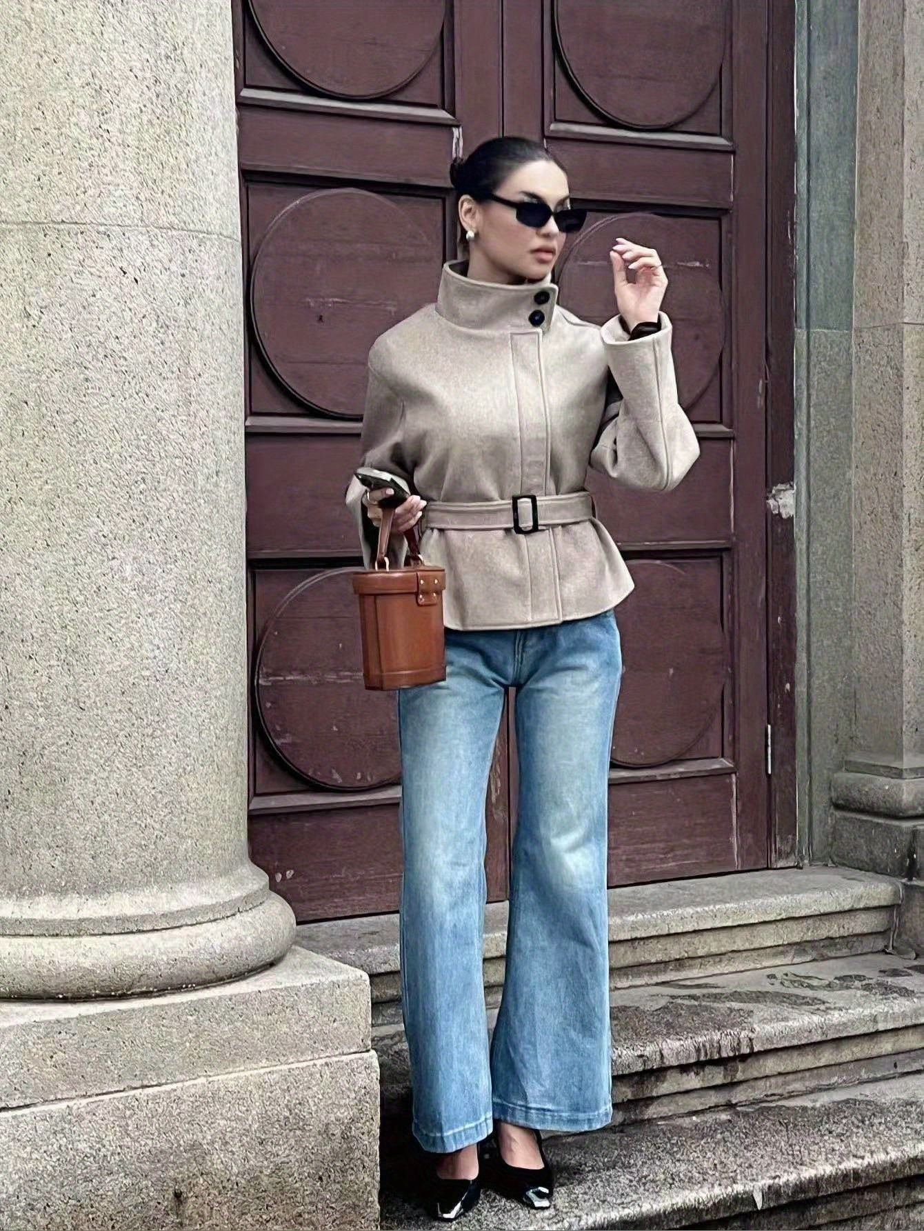 Autumn/Winter Elegant Stand Collar Tweed Belt Waist Coat Jacket Casual Fashion Long Sleeve Women's Outerwear