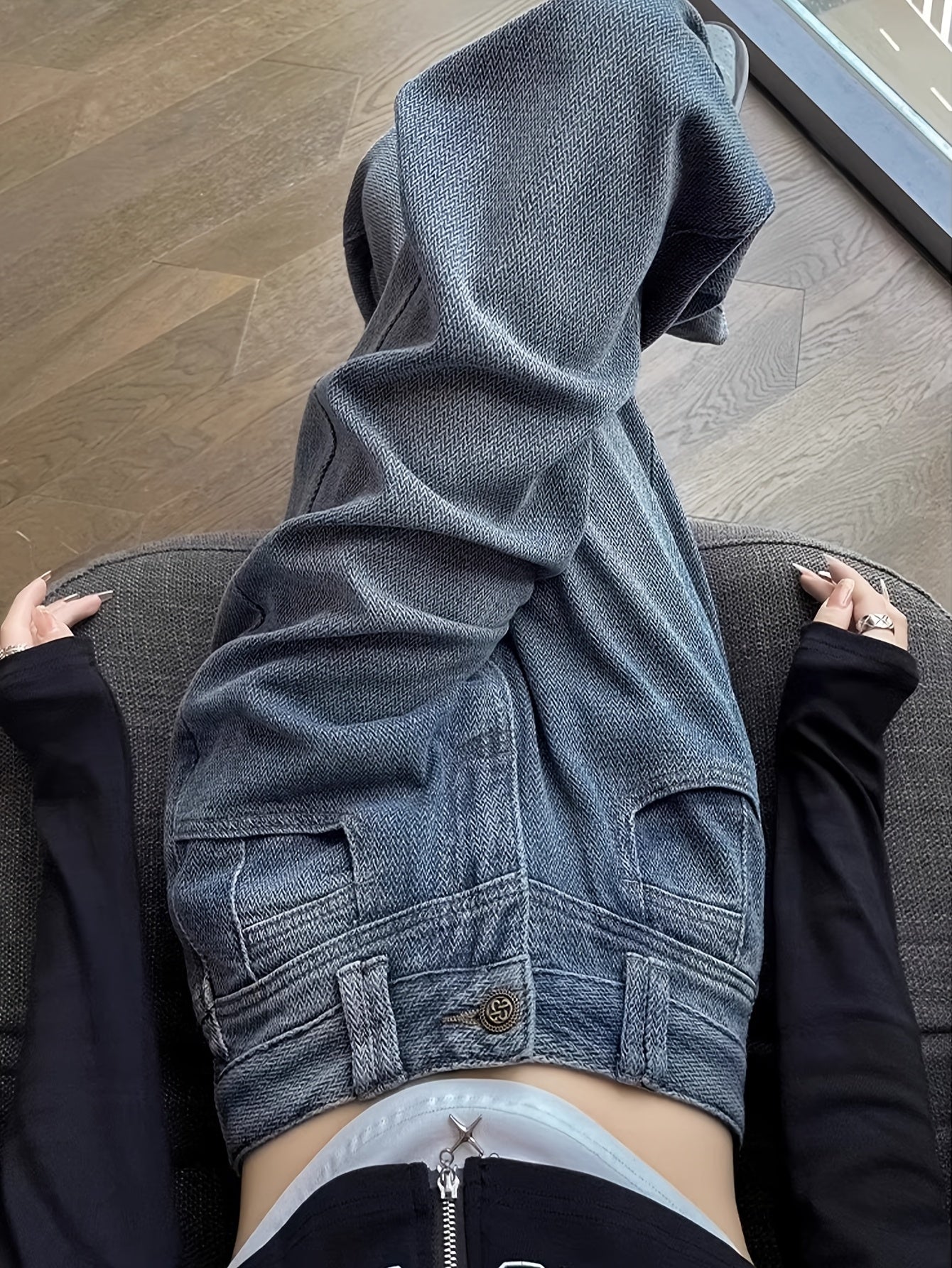 Retro Blue Distressed Jeans Retro Blue Distressed Women's High-Rise Loose Straight Cut Jeans | Frayed Hem Y2K 90s Style Denim Pants, Machine Washable Casual All-Season Comfort
