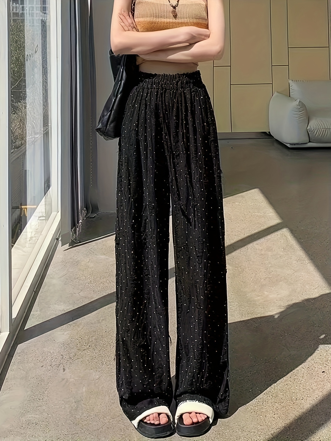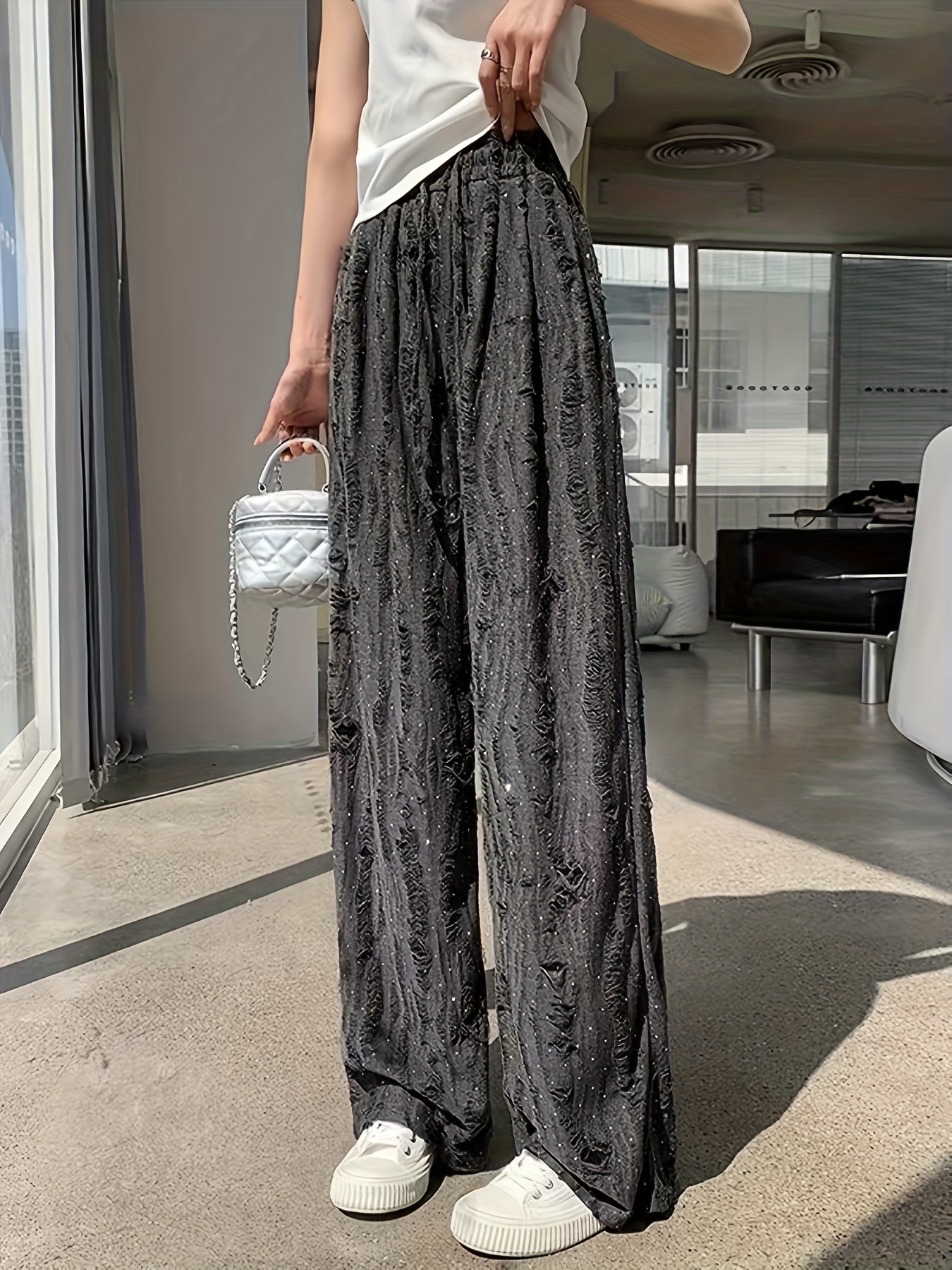 Solid Wide Leg Wide Leg Pants, Casual Ripped Holes Tied Elastic Waist Comfy Pants For Summer & Fall, Women's Clothing