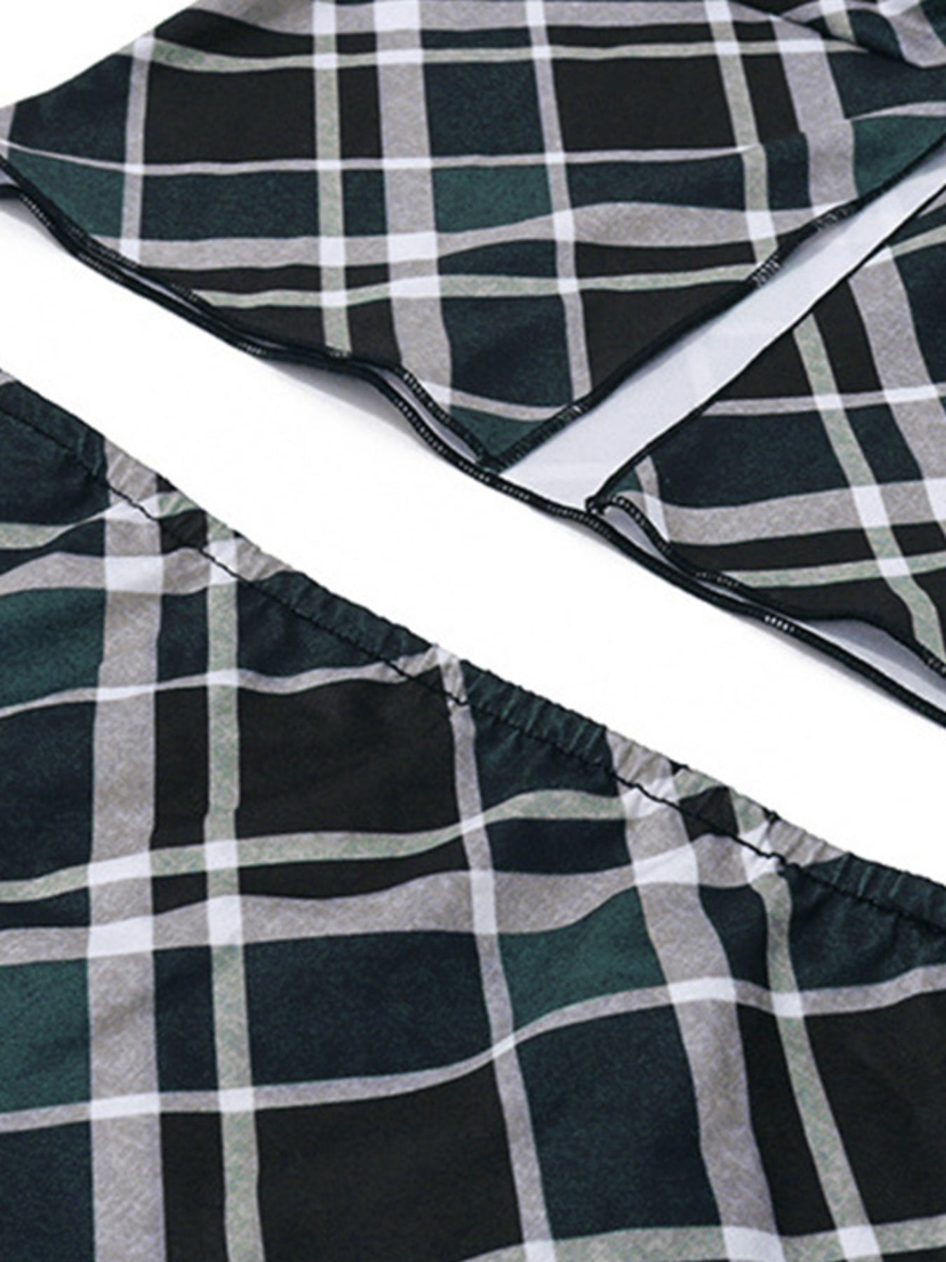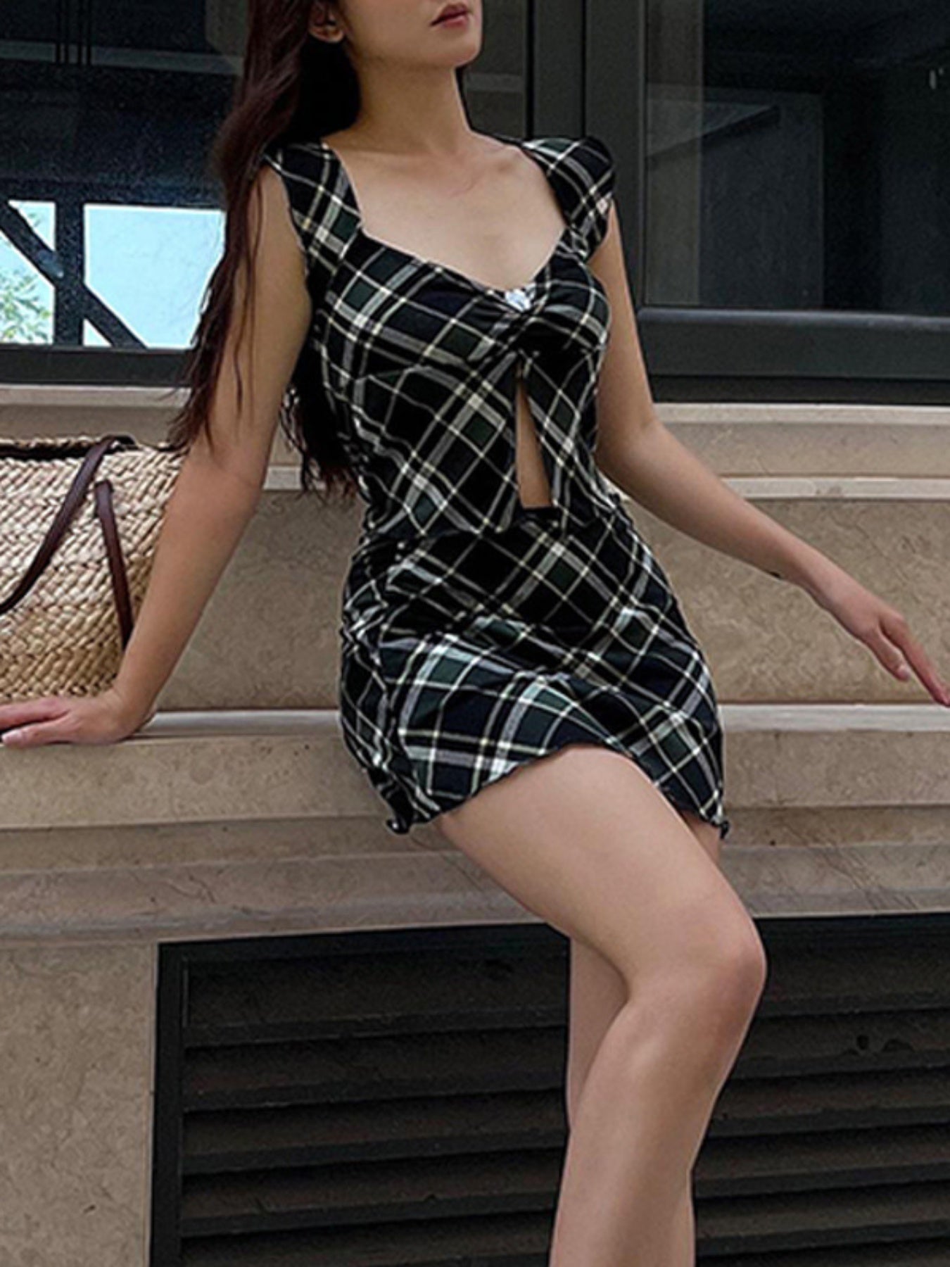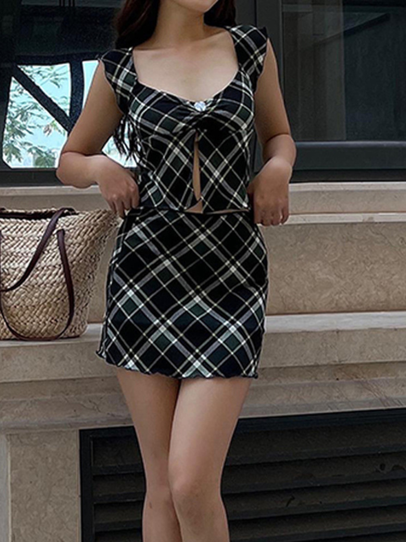 Women 2pcs Outfits Vintage Plaid Split Tank Tops and Mini Skirt Summer Streetwear Aesthetic Clothes